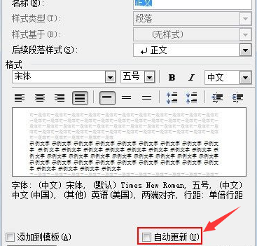 4选中“自动更新”复选框 小提示:“正文”样式无法启用“自动更新”功能。
