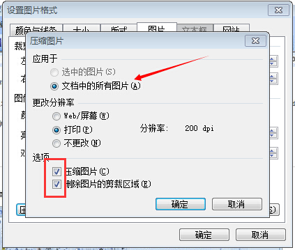 2、在“压缩图片”对话框,选择应用于“文档中的所有图片”,分辨率可更改为“打印”、勾选“压缩图片”、“删除图片的剪裁区域”选项。