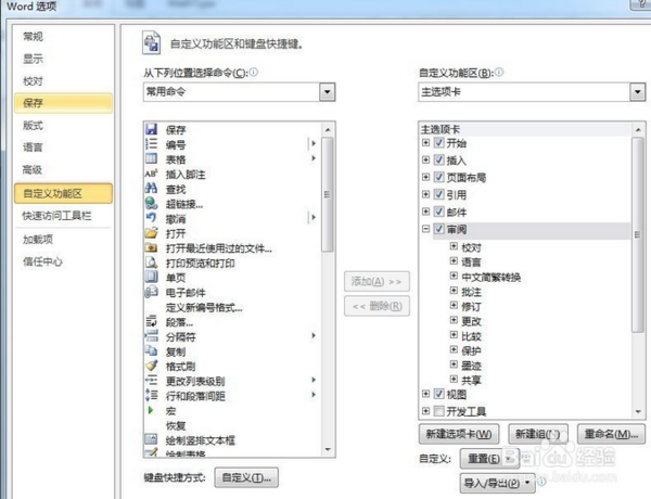 3、弹出如图窗口,选择‘自定义功能区’,在右侧的‘主选项卡’中找到‘审阅’并将其勾选上,这样您的Word中就将‘审阅’菜单添加上了,若还没有,则关闭文档从新打开一边,若不想每次都有这个菜单,用同样的步骤将其勾掉即可