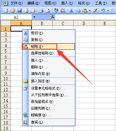 2、再打开Excel2003,新建一个工作簿,用鼠标在空白单元格处右击并选择“粘贴”命令。