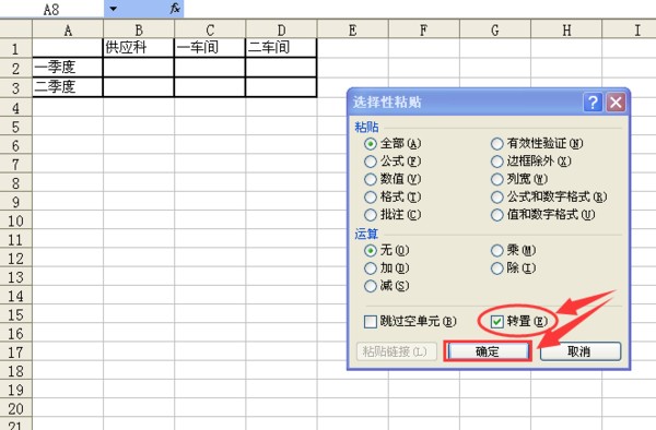 4、在空白单元格处再次右击并执行“选择性粘贴”命令,同时勾选上“转置”复选框后点击“确定”按钮。