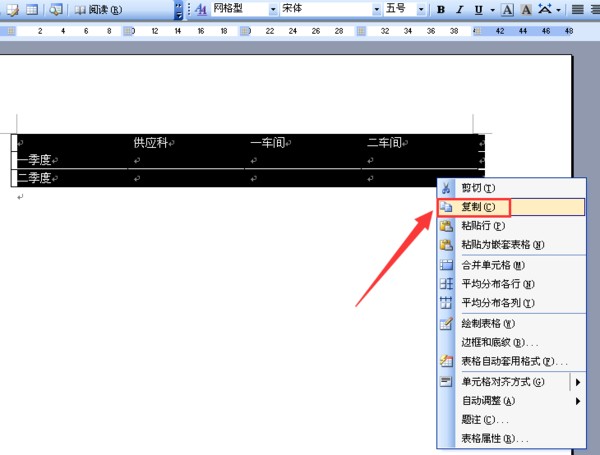 1、打开Word2003文档,选中需要进行行列对调的表格,右击执行“复制”命令。
