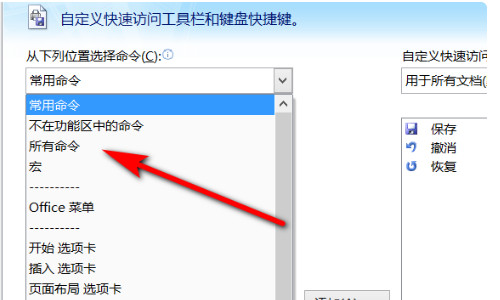 3、接着,在自定义的界面点击所有命令的选项。