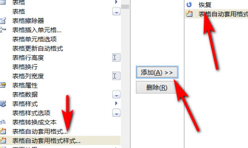 4、之后,在所有命令的菜单列表中就可以看到表格自动套用格式样式,再依次点击表格自动套用格式样式——添加。