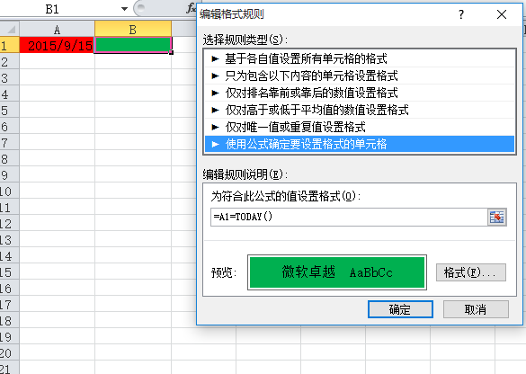 B1条件格式同样可以设置为=A1=today()