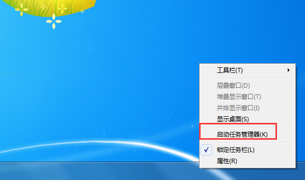1、这里以win7系统的电脑为例子,首先在主页面的下方空白位置鼠标右击,并且在弹出来的页面选择【启动任务管理】。