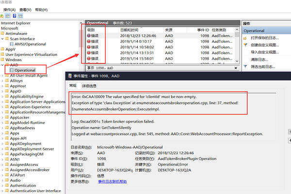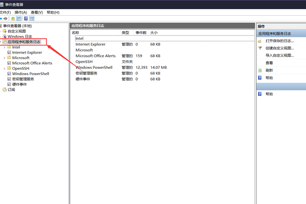2、 回车出现"事件查看器",打开后,点击"应用程序和服务日志",等待扫描加载日志完毕后。