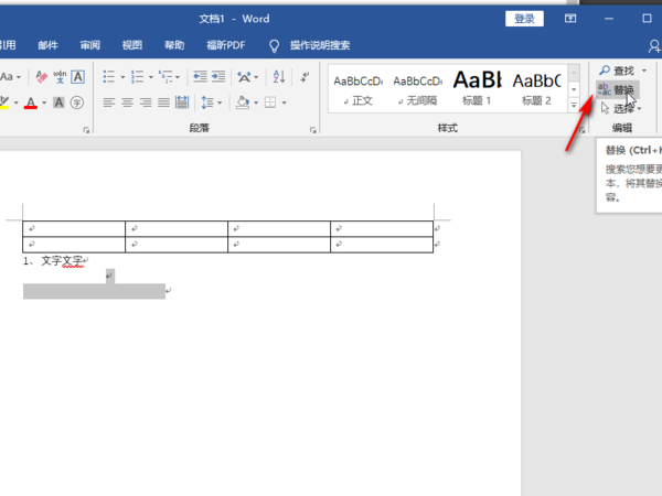3、选择我们想要删除的空白段内容,需要将换行符选中,也就是word中的硬回车,然后找到工具栏中的替换选项,点击。