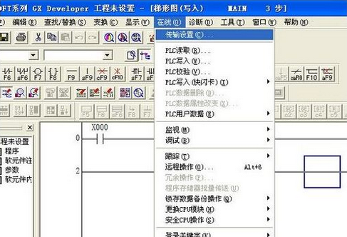回到PLC编程软件,选择“在线”菜单栏,从下拉菜单中选择“传输设置”。