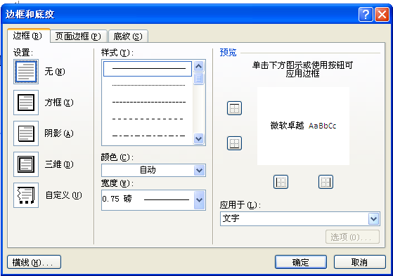 4、弹出边框和底纹对话框,选择边框选项卡,在设置处选择无即可,如图所示。