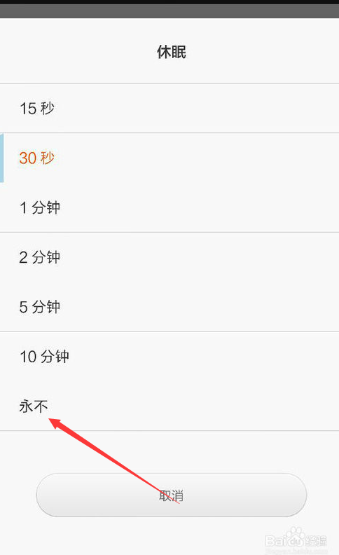 4、在休眠下选择,永不休眠,这样手机就不会黑屏,只有用户在手动按下锁屏键后屏幕才会关闭。