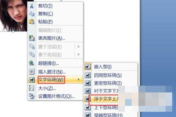 5、之后我们右击图片,弹出的界面,我们点击文字环绕,之后我们点击浮于文字上方。