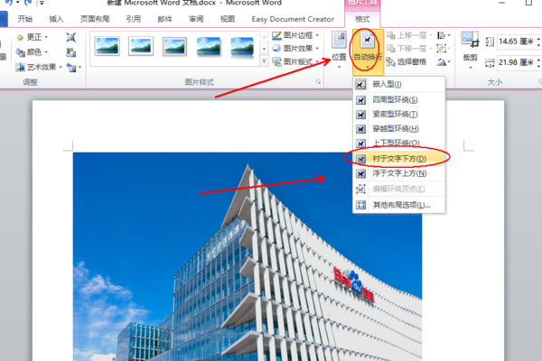 3、在图片格式工具中,点击“自动换行”,然后在其下拉选项中点击选择“衬于文字下方”。
