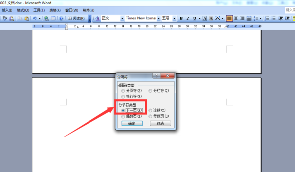2、打开”分隔符“的界面后,在“分节符类型”下,点击选中”下一页“后,再点击”确定“;