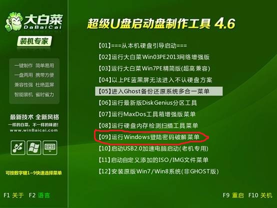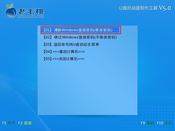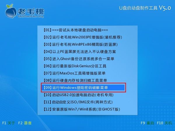 1.首先准备一个制作好的u盘启动盘,把u盘插进电脑,开机按DEL键进入BIOS,设置从U盘启动,重启,在出现老毛桃的主菜单界面时,将光标移动到“【09】运行Windows登陆密码破解菜单”后按回车键,如下面图示: