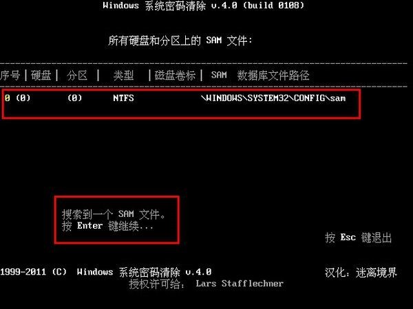 5.此时会自动搜索此分区中的文件sam,搜索时间大概在数秒钟之内,在提示已经搜索到“sam”文件了后按回车键继续!如下图所示: