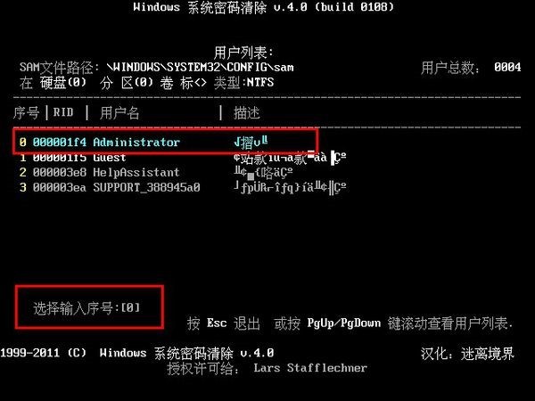 6.此时所列出的是这个文件内所记录下此电脑的所有账户信息。在此寻找需要清楚登录密码的账户,通常来说“administrator”用户是电脑上所常用的电脑账户。输入对应的序号0,按回车即可。下图为接上图之后按下回车键进入相关选项的界面: