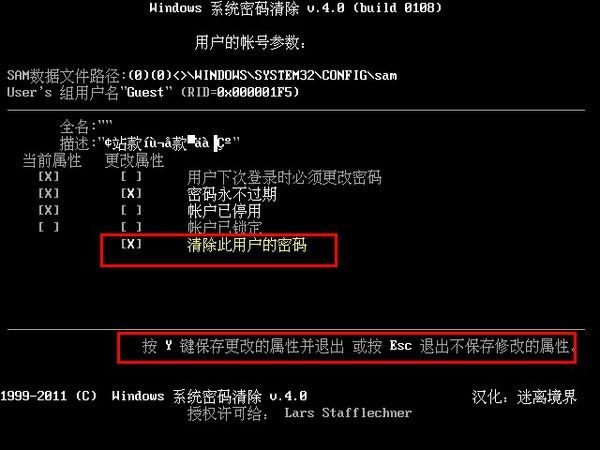 7.在出现此画面时只需要按下“Y”键即可清除当前用户登录的密码!在提示已清楚成功后可直接重启电脑。如下面图示:
