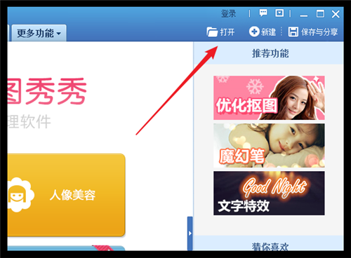 1、点击打开美图秀秀软件,在美图秀秀页面点击右上角“打开”,然后打开需要编辑的图片。