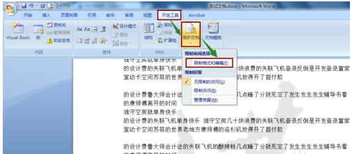 在已经添加水印的文档内,单击 开发工具 - 保护文档 - 限制格式和编辑。