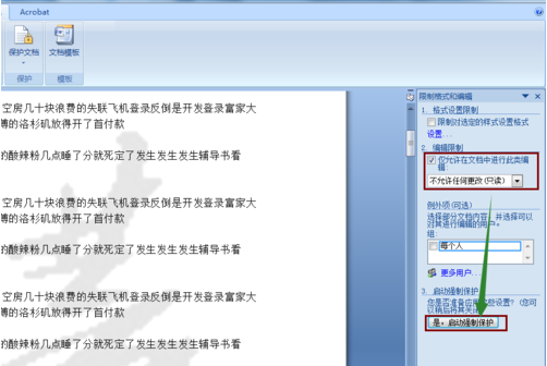 在右侧 限制格式和编辑中,仅允许在文档中进行此类编辑 前打勾,下拉框选择 不允许任何更改(只读)单击 是,启动强制保护。