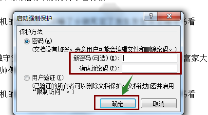 在 启动强制保护 窗口设置一个密码,单击确定,保存文档即可。保存后的文档,如果打开的人不知道我们刚刚设置的密码,那么他是无法删除我们添加的水印的,达到了保护水印不被删除的目的。