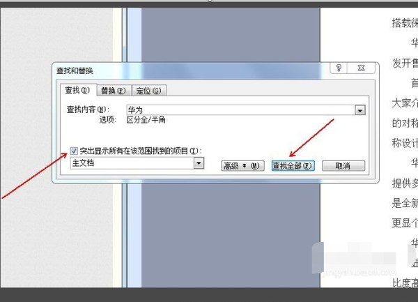 4、并勾选“突出显示所有在该范围找到的项目”,再点击“查找全部”按钮。