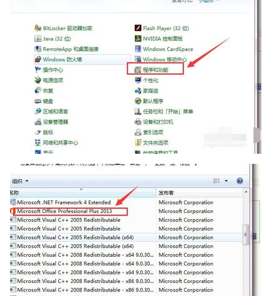 1.打开控制面板,点击“程序和功能”,找到Microsoft Office(要卸载的软件),确认卸载,如图所示。