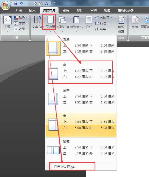 2.通过页面布局——页边距——自定义页边距,把左右的页边距设置大一些就能把页面变窄。
