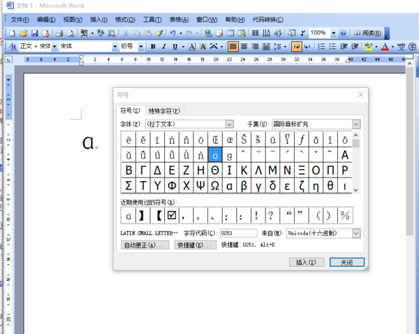 在 Microsoft Office Word 2003 中输入汉语拼音字母 a 的小写方法: