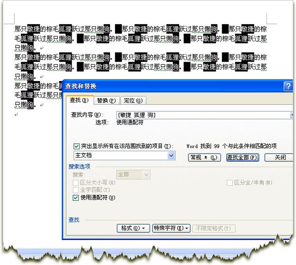 勾选“突出显示所有在该范围内找到的项目”,且勾选“使用通配符”。最后单击“查找全部”按钮即可。