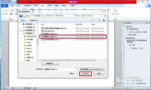 在“选择收件人”选项区域中选中“使用现有列表”单选,在“浏览”超链接中,打开所选择的数据源。如图所示选择,单击“确定”。