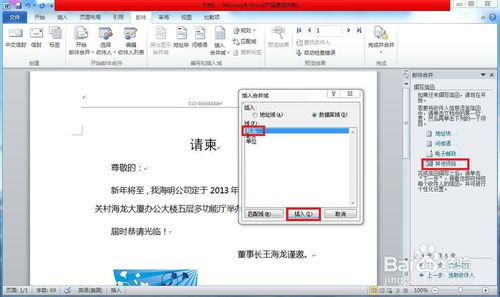 选择收件人的列表后。单击“下一步:撰写信函”超链接,在“撰写信函”区域中单击“其他项目”超链接,打开“插入合并域”对话框,在“域”列表中选择“姓名”域,单击“插入”按钮,之后关闭按钮。单击“下一步“预览信函”就可以看到不同的邀请人的姓名了。