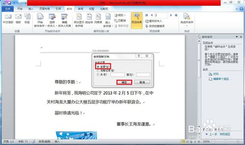 单击”下一步:完成合并“超链接,进入”邮件合并分布向导“的最后一步,单击”编辑单个信函“,打开”合并到新文档“对话框,在”合并记录“选项区域中,选中”全部“按”确定“就可以看到所有的请柬了。