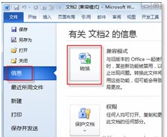3.、再次单击【文件】按钮打开后台视图,然后在“信息”视图中单击【转换】按钮,即可将当前文档更改为Microsoft 2010的格式,如图所示。