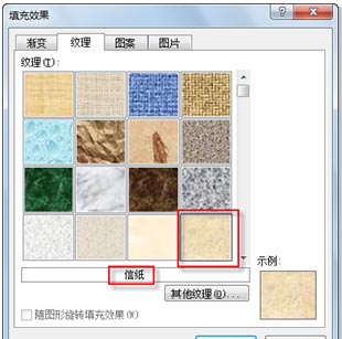 3、 在“纹理”区域选择合适的填充效果,如,选择“信纸”纹理,如图所示。