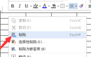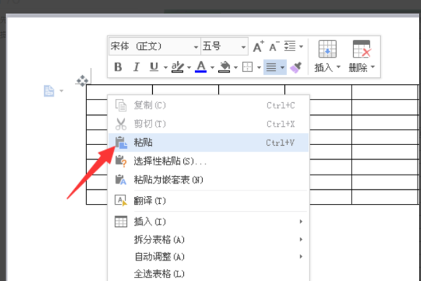 5、点击word表格,把鼠标在第一个单元格内单击,右击,在弹出菜单内选择“粘贴”。