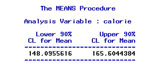 proc means data=hotdog alpha=0.1 clm;