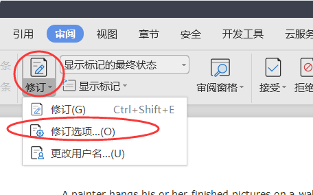 3、之后点击修订下方的小三角,选择修订选项。