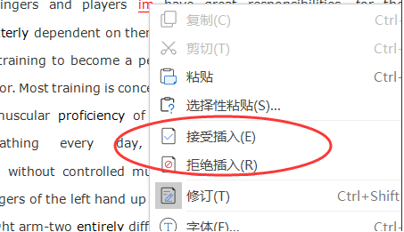 7、右击修订的位置,选择接受插入(删除)才会执行修改的操作,选择拒绝插入(删除)痕迹就会消除。
