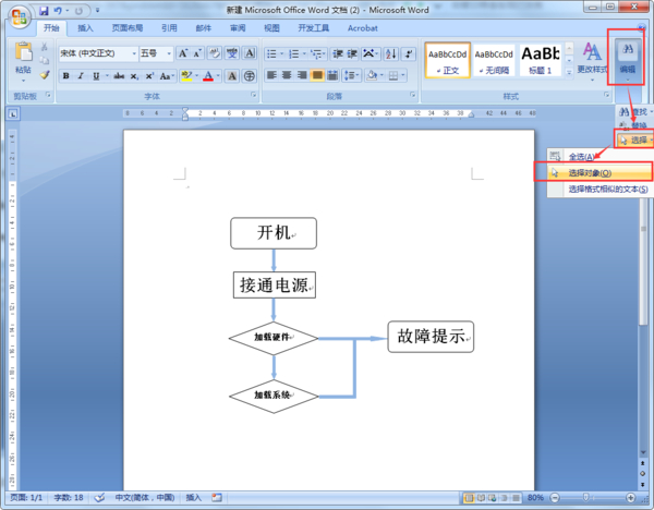 2、在上方菜单栏“开始”选项卡下“编辑”选项卡中“选择”选项的下拉菜单中点击“选择对象”,如下图所示。