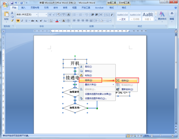 3、点击选择对象后,选中整个流程图,然后在选中区域单击鼠标右键,在右键菜单中选择“组合”选项下的“组合”,如下图所示。