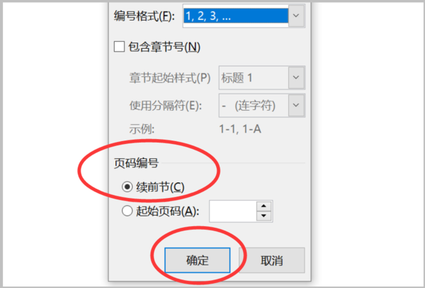 3、然后在打开的设置页码的窗口中点击勾选“续前节”选项,点击确定。