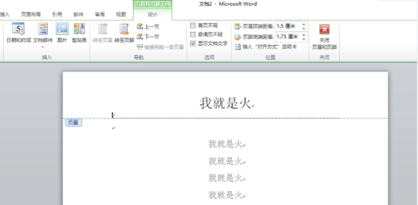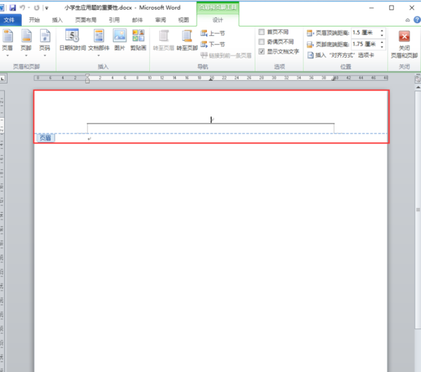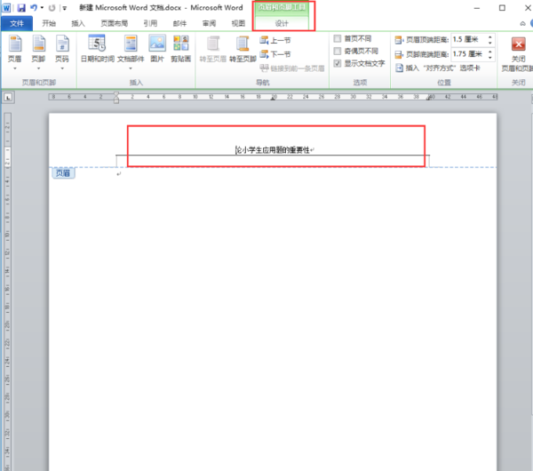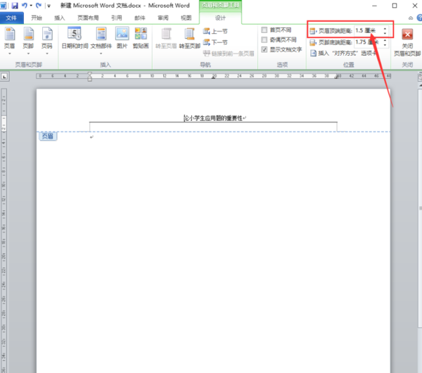 3、调整“位置”工具组中的“页眉顶端距离”实现位置的调整。