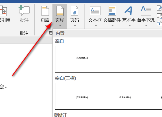 4、在随后弹出的界面右侧点击“页脚”,任意插入一个页脚。