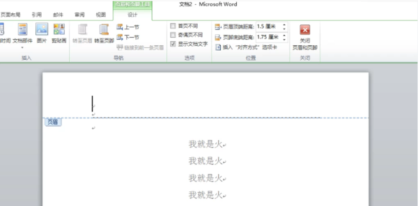 2、在激活页眉区域的时候,我们可以看到“页眉和页脚工具设计”选项卡同时被激活