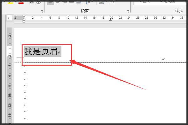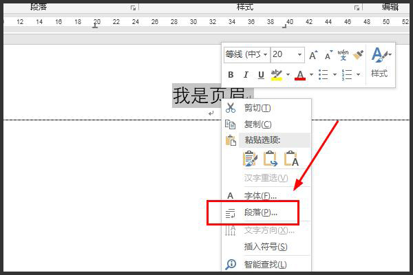 2、默认的页眉插入之后在正上方,输入需要的文字之后选中点击右键呼出下拉菜单,点击菜单中的段落选项卡。