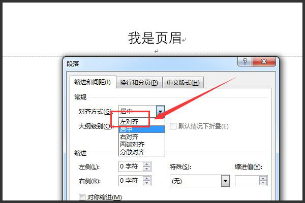 3、在段落设置菜单中点击对齐方式后方的下拉菜单打开下拉菜单选择左对齐。