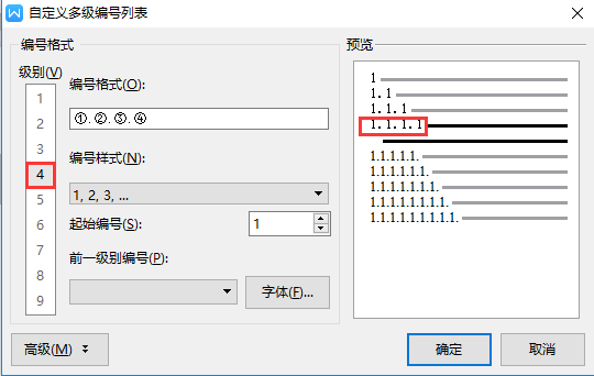四级默认的编号格式是1.1.1.1 。另外,还可以自定义格式, 通过“编号样式”选项,来进行设置。