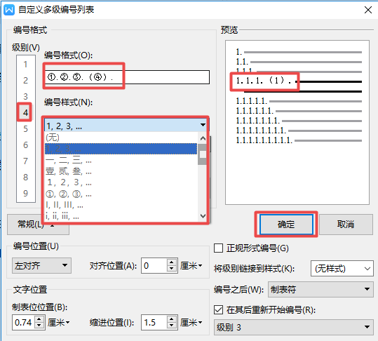 2、在“自定义多级编号列表”界面,点击“级别4”,可通过设置“编号格式”和“编号样式”,来自定义4级编号。在“编号样式”的下拉文本框中,有很多可选样式。
